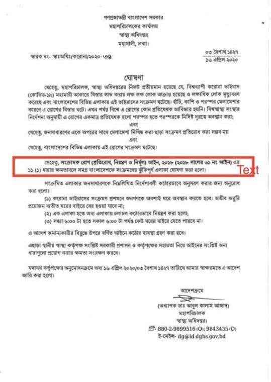 এতে বলা হয়, দেশের বিভিন্ন এলাকায় এই ভাইরাসের সংক্রমণ ঘটেছে। এর কোনও প্রতিষেধক আবিষ্কার হয়নি। এসব কারণে সংক্রামক রোগ ২০১৮ এর ১১ (১) ধারা ক্ষমতাবলে সমগ্র বাংলাদেশকে সংক্রমণের ঝুঁকিপূর্ণ এলাকা ঘোষণা করা হলো।
