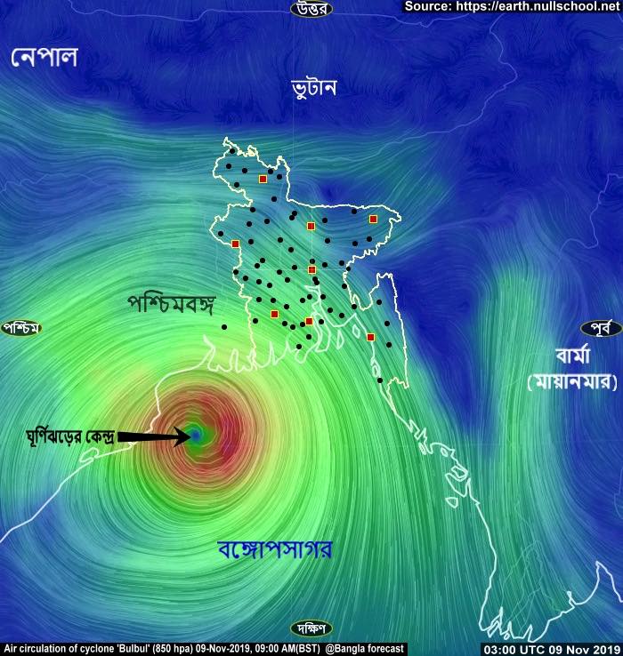 মহাদূর্যোগের কেন্দ্রস্থলে রয়েছে বাংলাদেশ। গত ২৪ ঘন্টায় ঘূর্ণিঝড় ‘বুলবুল’ ক্রমশ উত্তর এবং উত্তর-পূর্বে দ্রুত গতিশীল থেকে অতি প্রবল ঘূর্ণিঝড়ে পরিনত হয়েছে। ঘূর্ণিঝড় কেন্দ্রের ৭৪ কিঃমিঃ এর মধ্যে বাতাসের একটানা সর্বোচ্চ গতিবেগ ১৩০ কিঃমিঃ যা দমকা বা ঝড়ো হাওয়ার ঝাপ্টা আকারে ১৫০ কিঃমিঃ পর্যন্ত বৃদ্ধি পাচ্ছে বলে আবহাওয়া অফিস সূত্রে জানা গেছে।