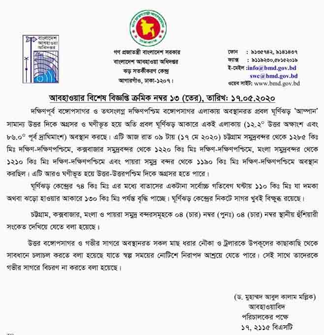 রাতে আবহাওয়া দপ্তরের বিশেষ বিজ্ঞপ্তিতে বলা হয়, ঘূর্ণিঝড় আম্ফান রাতে চট্টগ্রাম সমুদ্র বন্দর থেকে ১২৮৫ কিলোমিটার দক্ষিণ-দক্ষিণপশ্চিমে, কক্সবাজার থেকে ১২২০ কিলোমিটার দক্ষিণ-দক্ষিণপশ্চিমে, মংলা সমুদ্র বন্দর থেকে ১২১০ কিলোমিটার দক্ষিণ-দক্ষিণপশ্চিমে এবং পায়রা সমুদ্র বন্দর থেকে ১১৯০ কিলোমিটার দক্ষিণ-দক্ষিণপশ্চিমে অবস্থান করছিল। এটি আরো ঘনীভূত হয়ে উত্তর উত্তর-পশ্চিম দিকে অগ্রসর হতে পারে।