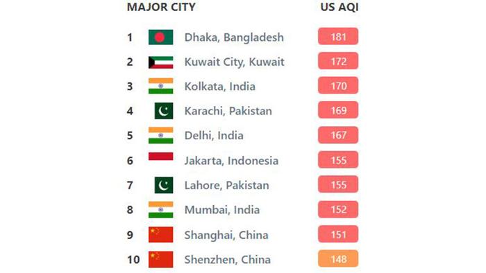 এয়ার কোয়ালিটি ইনডেক্সের তথ্য অনুযায়ী, বায়ুর মানের সূচক ১৮১ নিয়ে প্রথম স্থানে রয়েছে ঢাকা। আর ১৭২ নিয়ে দ্বিতীয় স্থানে কুয়েত সিটি। আর ১৭০ নিয়ে তৃতীয় স্থানে রয়েছে কলকাতা। তারপরে রয়েছে পাকিস্তানের রাজধানী করাচি। তাদের বায়ুর মান ১৬৯। বায়ুর মান ১৬৭ নিয়ে এরপরের স্থানে রয়েছে ভারতের রাজধানী দিল্লি। ১৫৫ বায়ুর মান নিয়ে ষষ্ঠ স্থানে রয়েছে ইন্দোনেশিয়ার রাজধানী জাকার্তা। এছাড়া লাহোরের বায়ুর মান ১৫৫, মুম্বাইয়ের ১৫২, সাংহাইের ১৫১ ও শেনিয়াং এর ১৪৬।