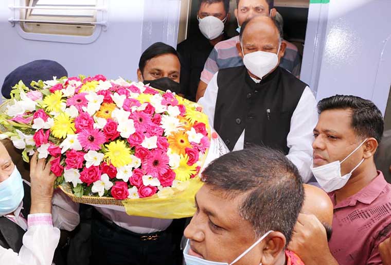 ফুল দিয়ে রেলমন্ত্রীকে শুভেচ্ছা জানাচ্ছেন নিজাম উদ্দিন হাজারী এমপি ও জেলা আওয়ামী লীগের নেতাকর্মীরা