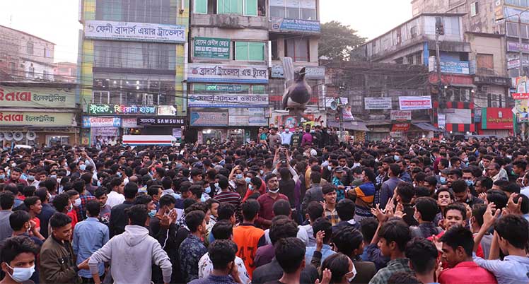 কুষ্টিয়ায় বঙ্গবন্ধু শেখ মুজিবুর রহমানের ভাস্কর্য ভাংচুর ও অবমাননার প্রতিবাদে ফেনীতে বিক্ষুব্ধ যুবলীগ-ছাত্রলীগের নেতাকর্মীরা। এ ঘটনার প্রতিবাদে আজ রবিবার (৬ ডিসেম্বর) রাস্তায় নেমে বিক্ষোভ মিছিল ও সমাবেশ করেছে বাংলাদেশ আওয়ামী লীগের এ দুই সহযোগি সংগঠন।