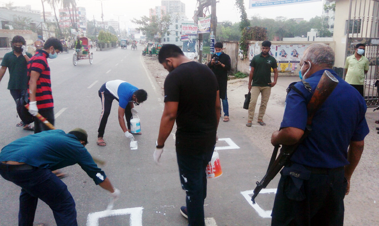 করোনা ভাইরাসের (কোভিড-১৯) সংক্রমণের ঝুঁকি কমাতে ফেনীতে কাঁধে কাঁধ মিলিয়েছে ফেনী মডেল থানার পুলিশ ও স্বেচ্ছাসেবী সংগঠনের যুবকেরা। শহরের জনাসমাগমপূর্ণ স্থানে সামাজিক দুরত্ব বজায় রাখতে যুবকরা শুক্রবার (২৭ মার্চ) সন্ধ্যায় ঔষধ দোকান, কাঁচাবাজার, শপিংমলের সামনে সাদা রং দিয়ে বর্গাকার চিহ্ন এঁকে দূরুত্ব চিহ্নিত করার কাজ শুরু করে। এতে অংশ নেয় স্বেচ্ছাসেবী আমের মক্কী, আমির সহ ১০/১৫ জন যুবক।