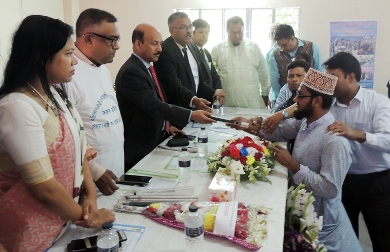 অনুষ্ঠানে দৃষ্টি প্রতিবন্ধীদের মাঝে সাদাছড়ি ও ক্রেচ বিতরণ করা হয়।