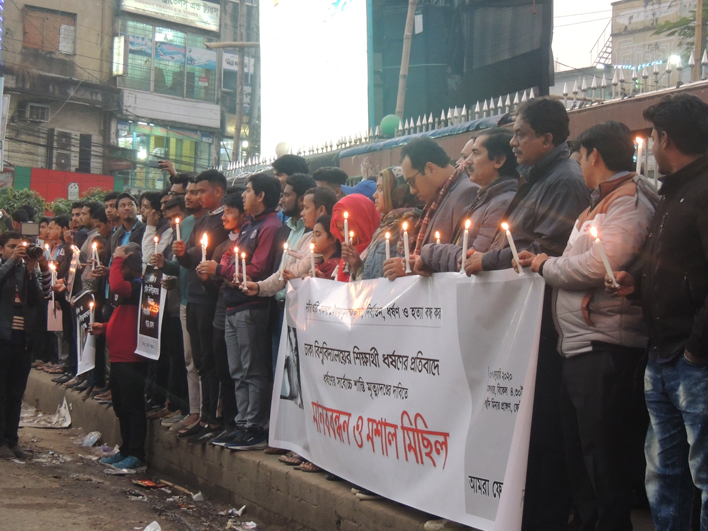 মানববন্ধন শেষে সন্ধ্যায় মশাল সহযোগে একটি বিক্ষোভ মিছিল বের করা হয়। মশাল মিছিলটি শহীদ মিনার প্রাঙ্গন থেকে শুরু হয়ে শহরের খেজুর চত্ত্বর, দোয়েল চত্ত্বর ও প্রেসক্লাব প্রদক্ষিণ করে পুনরায় শহীদ মিনারে এসে বিক্ষোভ সমাবেশে মিলিত হয়। সেখানে ধর্ষকের বিচারের জন্য সরকারের দ্রুত পদক্ষেপ গ্রহণের দাবী জানায় তারা।