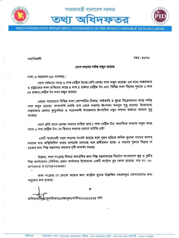মঙ্গলবার তথ্য অধিদফতর প্রকাশিত এক বিজ্ঞপ্তিতে বলা হয়েছে, “একটি স্বার্থান্বেষী মহল লবণের সঙ্কট রয়েছে মর্মে গুজব রটনা করে অধিক মুনাফা লাভের আশায় লবণের দাম অস্থিতিশীল করার অপচেষ্টা চালাচ্ছে বলে প্রতীয়মান হচ্ছে। এ ধরনের গুজবে বিভ্রান্ত না হওয়ার জন্য শিল্প মন্ত্রণালয় সকলের দৃষ্টি আকর্ষণ করছে।”