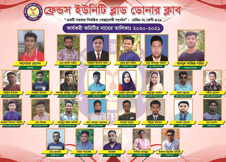 ফেনী জেলার সরকার নিবন্ধিত রক্তদাতা স্বেচ্ছাসেবী সংগঠন ফ্রেন্ডস ইউনিটি ব্লাড ডোনার ক্লাবের ২০২০-২১ কার্যবর্ষের পূর্ণাঙ্গ কমিটি ঘোষণা করা হয়েছে।