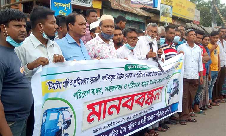 আজ (১৪ সেপ্টেম্বর) সোমবার বিকালে শহরের ট্রাংক রোড সংলগ্ন মুক্ত বাজারের সামনে আয়োজিত মানববন্ধনে টমটল চলাচলের জন্য সুনির্দিষ্ট নীতিমালার দাবি জানিয়েছেন মালিক ও চালকরা।