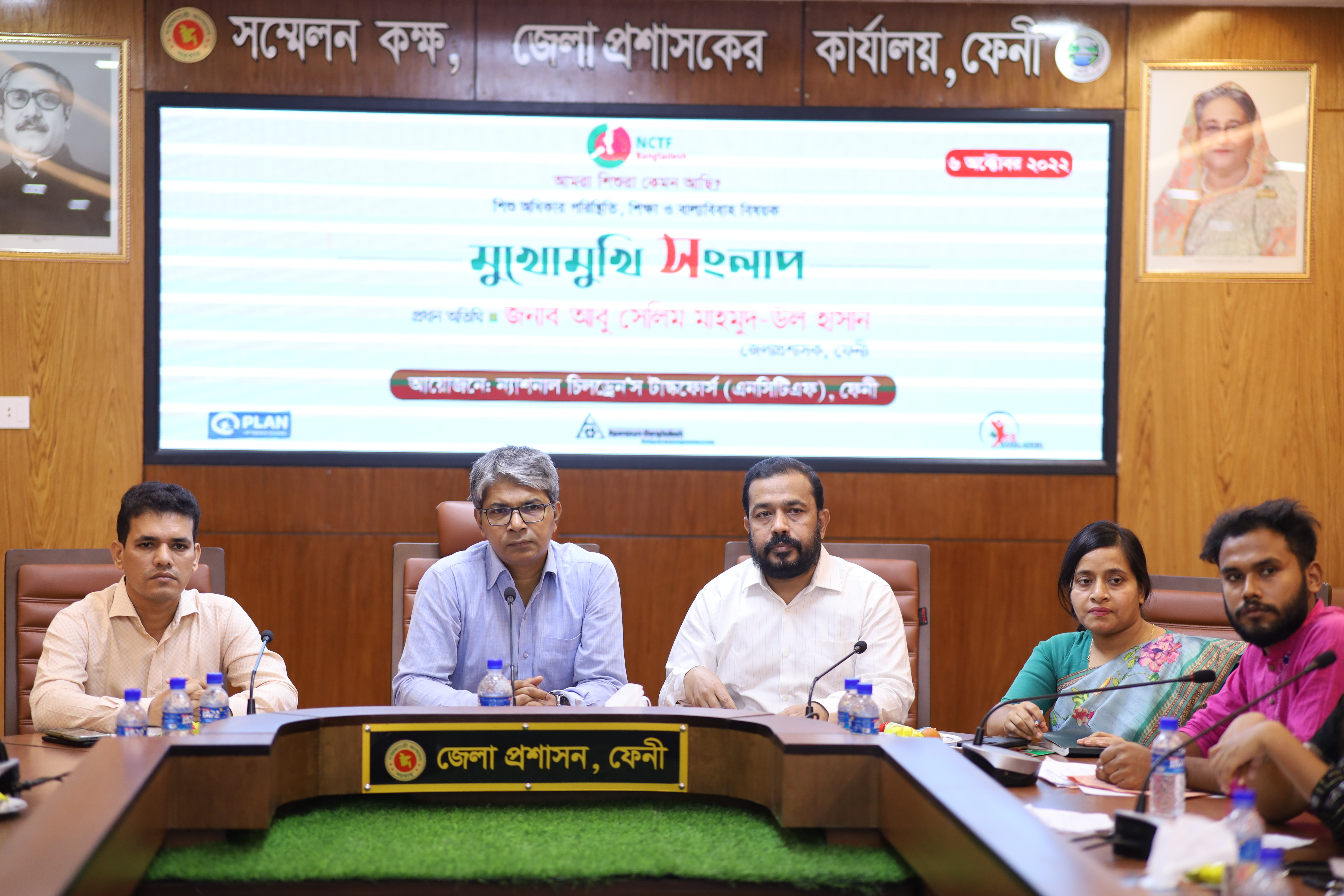 আমরা শিশুরা কেমন আছি? শিশু অধিকার পরিস্থিতি, শিক্ষা ও বাল্যবিবাহ বিষয়ে ন্যাশনাল চিলড্রেন'স টাস্ক ফোর্স (এনসিটিএফ) ফেনীর শিশুদের সাথে ফেনী জেলা প্রশাসক আবু সেলিম মাহমুদ-উল হাসানের মুখোমুখি সংলাপ অনুষ্ঠিত হয়েছে। বৃহস্পতিবার (৬ অক্টোবর) সকালে ইয়েস বাংলাদেশ,প্ল্যান ইন্টারন্যাশনাল ও অপরাজেয় বাংলাদেশ এর সহযোগিতায় জেলা প্রশাসকের সম্মেলন কক্ষে আয়োজিত সংলাপে প্রধান অতিথি ছিলেন জেলা প্রশাসক আবু সেলিম মাহমুদ-উল হাসান। এসময় শিশুরা জেলা প্রশাসকের কাছে বিভিন্ন সামাজিক অপরাধসহ শিশুদের নিরাপত্তায় বিভিন্ন প্রশ্ন তুলে ধরে সমাধান ও কার্যকরী প্রদক্ষেপ গ্রহণের দাবি জানান।
