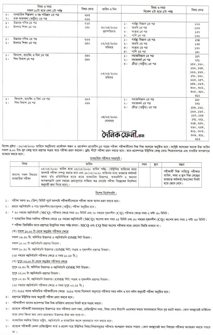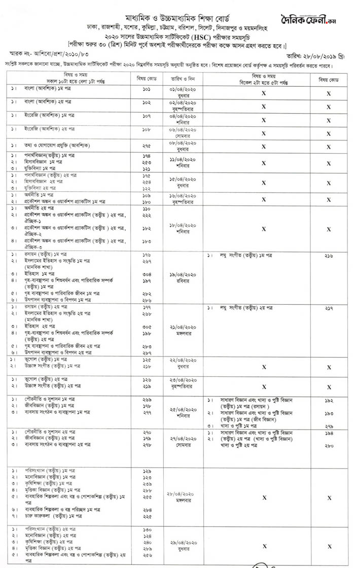 ২০২০ সালের এইচএসসি ও সমমান পরীক্ষার সময়সূচি: