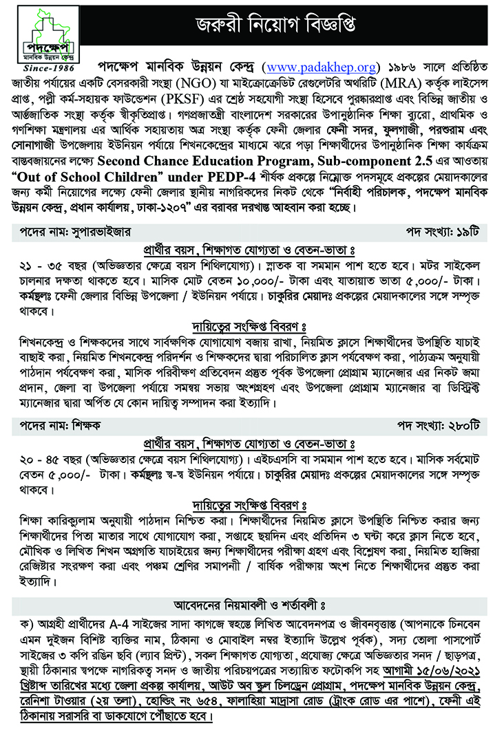 সুপাভাইজার এবং শিক্ষক পদে লোক নেবে জাতীয় পর্যায়ের বেসরকারী সংস্থা (এনজিও) পদক্ষেপ মানবিক উন্নয়ন কেন্দ্র। এ ব্যাপারে বিজ্ঞপ্তি প্রকাশ করেছে সংস্থাটি। আগ্রহীদের আগামী ১৫ জুন ২০২১ইং তারিখের মধ্যে জেলা প্রকল্প কার্যালয়, আউট অব স্কুল চিলড্রেন প্রোগ্রাম, পদক্ষেপ মানবিক উন্নয়ন কেন্দ্র, রেনিশা টাওয়ার (২য় তলা), হোল্ডিং নং- ৬৫৪, ফালাহিয়া মাদ্রাসা রোড (ট্রাংক রোড এর পাশে), ফেনী এই ঠিকানায় সরাসরি বা ডাকযোগে আবেদন পত্র পৌঁছাতে হবে।